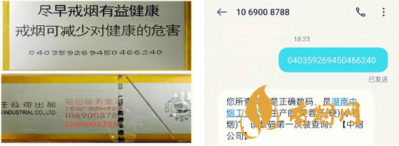 小盒背面底部印有18位查詢號碼,可以把18位查詢數(shù)字,發(fā)送短信到1069008788,進行查詢真?zhèn)?,提?ldquo;第一次被查詢”的為真煙,提示“第二次被查詢”的就要注意了。上圖為小盒背面18位查詢數(shù)字和側(cè)面短信查詢號碼以及短信查詢結(jié)果。