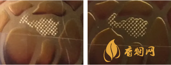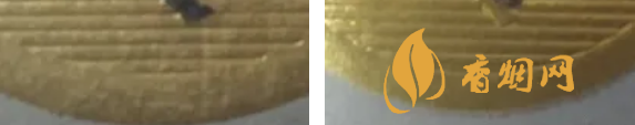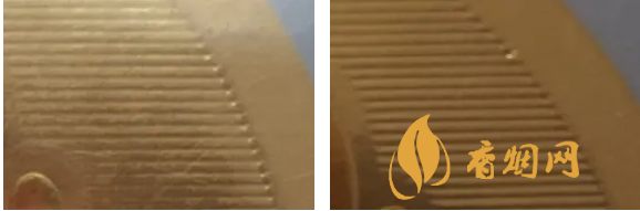 左真右假 真煙芙蓉花所在金色圓圈處,頂端與底部與內(nèi)圈交界處壓印的橫線較短,假煙較長。
