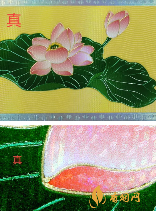 假煙:荷葉的燙金線不清晰,內(nèi)里有斷紋,同時(shí)沒有凹凸感,荷花花瓣邊緣的燙金線顏色很淺而且也有斷紋,葉脈與花瓣粘連。